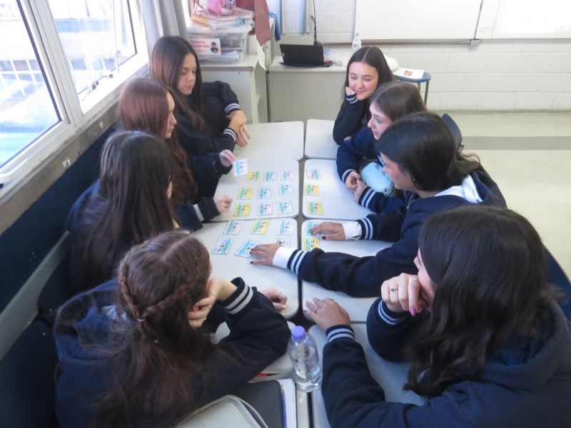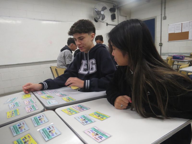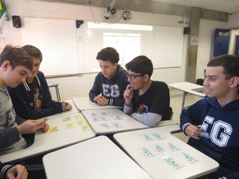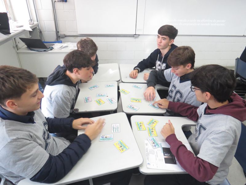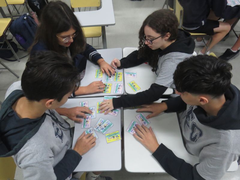 Os alunos se separaram em grupos para jogar. O jogo consistia em encontrar trios de cartas relacionadas a cada movimento literário estudado.