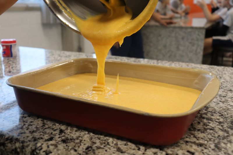 Os estudantes do 2º ano participaram de uma atividade, na cozinha experimental, acompanhados pela Cássia (responsável pela cozinha) e pelas professoras de Inglês Gabriela e Rosa. Juntos, prepararam uma deliciosa receita de carrot cake (bolo de cenoura).