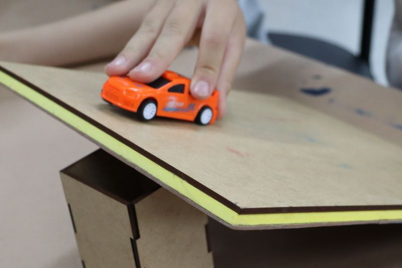 Durante a atividade, as crianças foram desafiadas a movimentar um carrinho sem utilizar as mãos diretamente. Com o auxilio da Maressa, experimentaram diversos materiais e estratégias criativas, colocando em prática conceitos relacionados à geração de força e movimento.