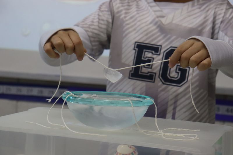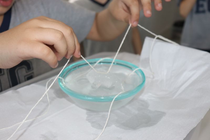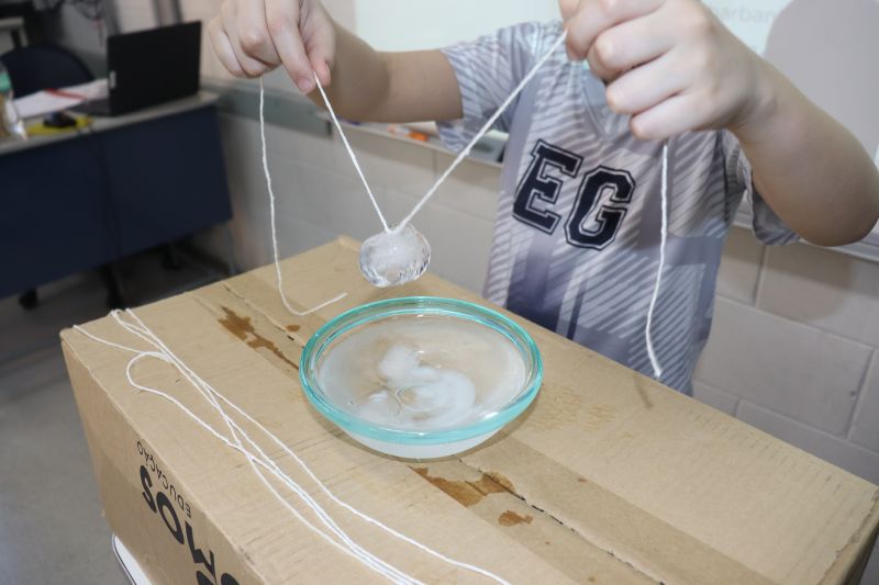 Para a realização do experimento, os estudantes utilizaram materiais simples: cubos de gelo, sal, barbante e um pote com água. O objetivo foi desafiá-los a "pescar" o gelo, usando o barbante e o sal.