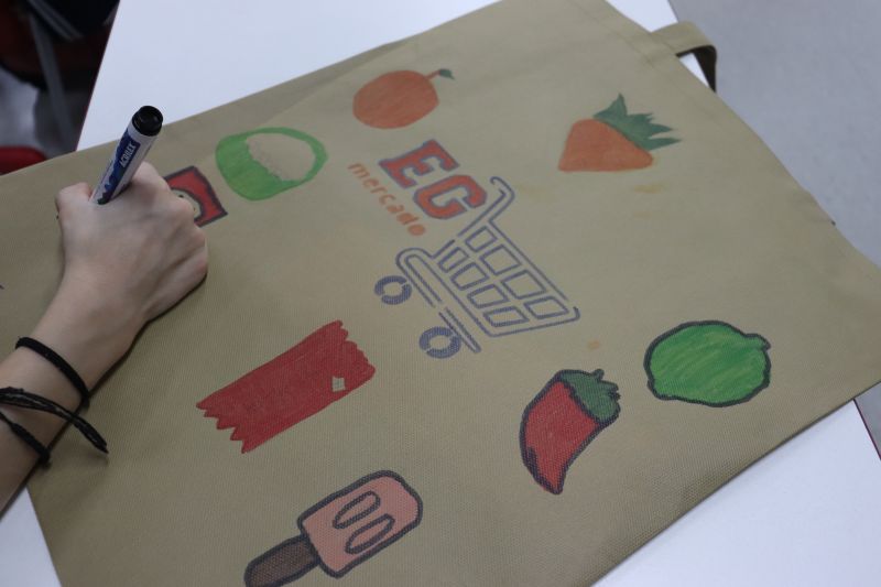 Para tornar a experiência ainda mais significativa, os alunos utilizaram sacolas retornáveis confeccionadas por eles mesmos durante as aulas de Arte, sob a orientação da Professora Vick. A produção das sacolas reforçou a importância da sustentabilidade e do consumo responsável, valores centrais do projeto.