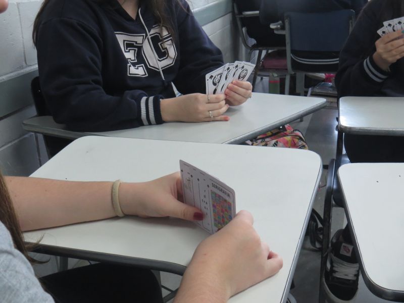 No jogo, os estudantes deveriam agrupar quatro cartas relacionadas a um mesmo conceito. De forma lúdica e divertida, a proposta permitiu que os alunos revisassem conteúdos essenciais em vestibulares e processos seletivos.