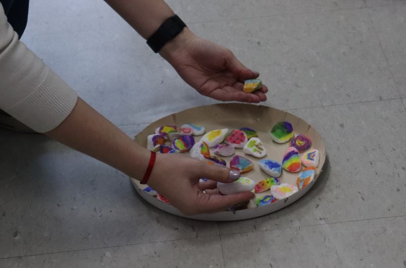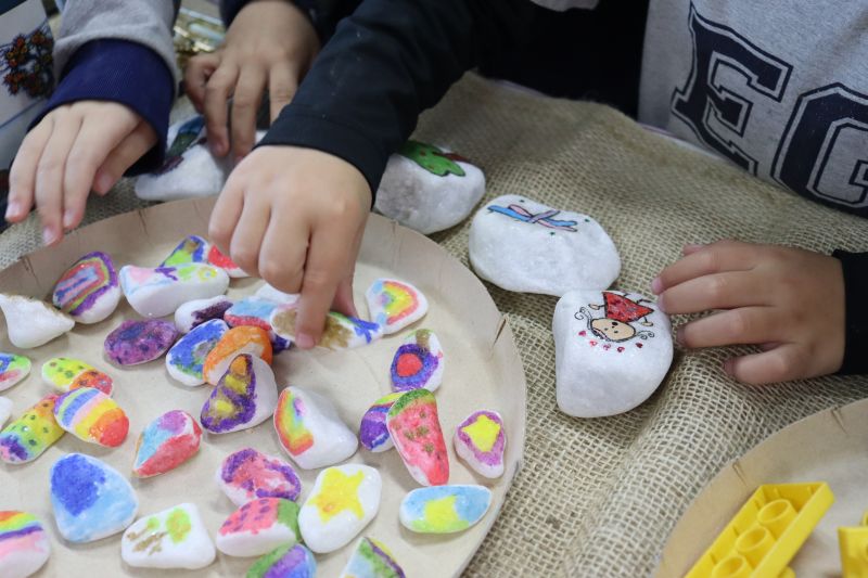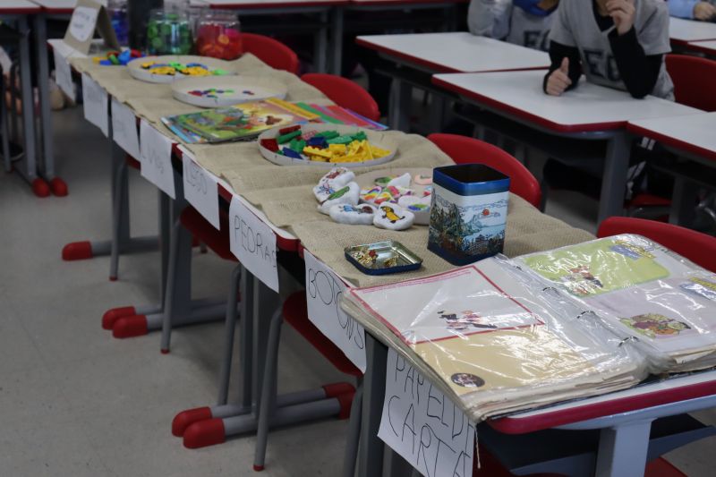 A exposição tinha coleções de pedras customizadas, carrinhos, tampinhas de garrafa pet, botões, livros, Lego, bottom e papéis de cartas.