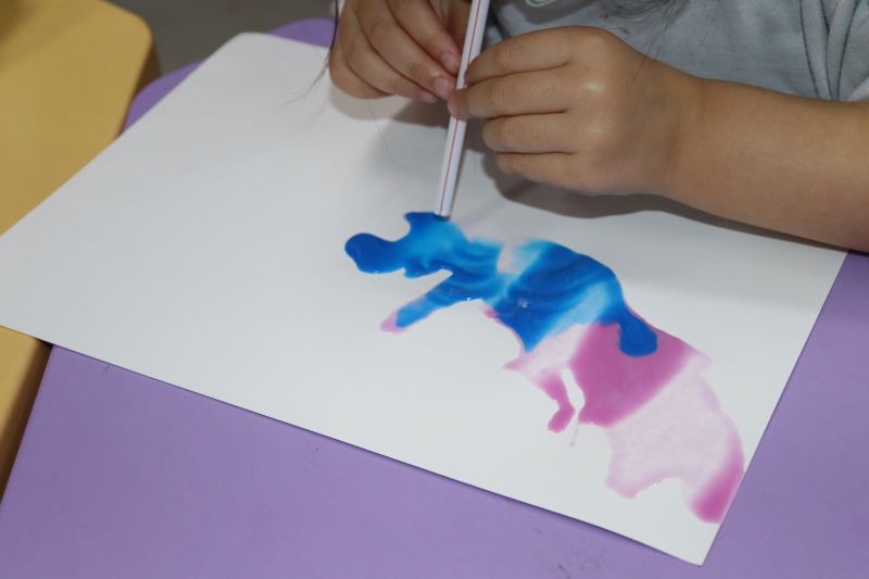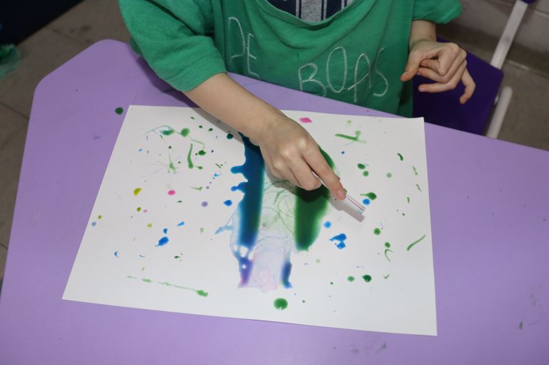 Na primeira etapa da atividade, as crianças fizeram a pintura do sopro: colocaram tinta sobre uma folha em branco e, com a força do próprio sopro, criaram lindas e criativas pinturas.