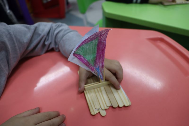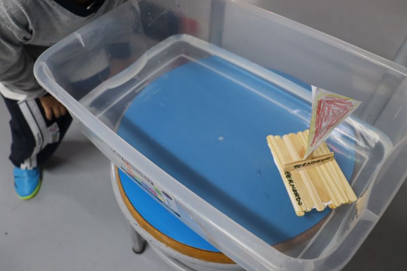 Após a criação, para simular a navegação e o movimento do mar, a turma brincou de mover suas jangadas, utilizando o próprio sopro para imitar o vento, um exercício lúdico que também trabalha o controle respiratório.