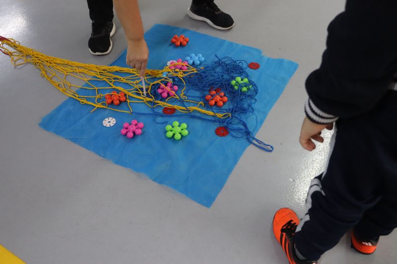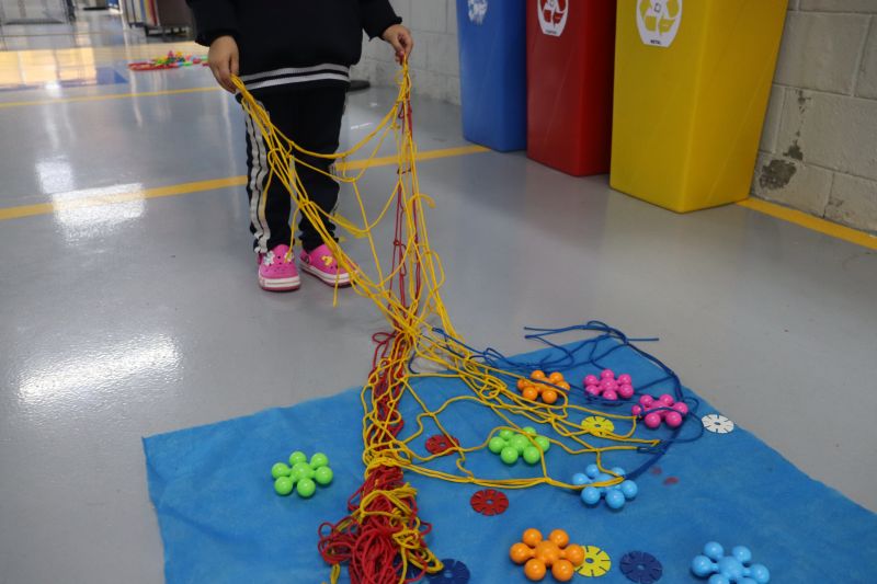 Logo em seguida, a turma se dividiu em dois grupos. Utilizando uma rede, os grupos participaram de uma “pescaria” simulada, na qual o foco foi o raciocínio lógico e a contagem, pois o desafio era contar os diferentes tipos de “peixes” capturados pelas equipes.