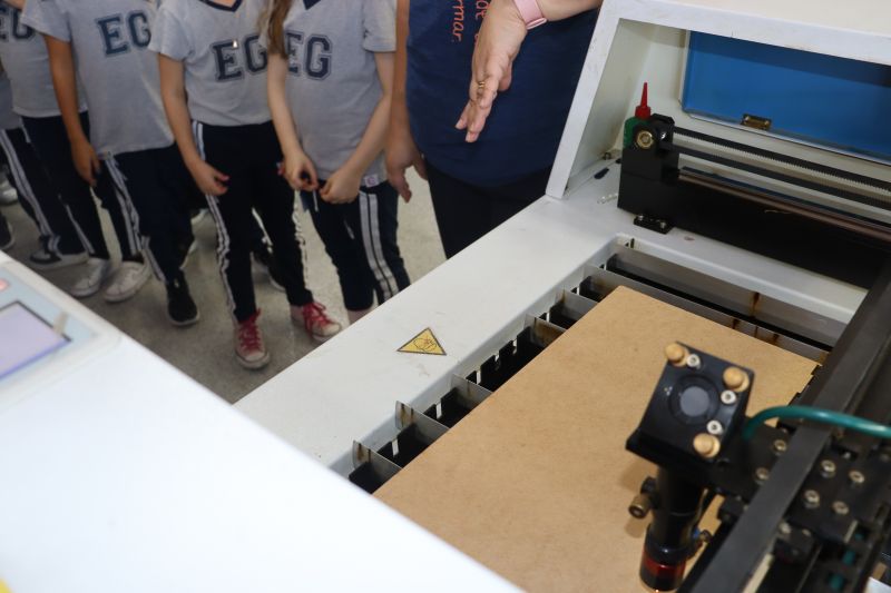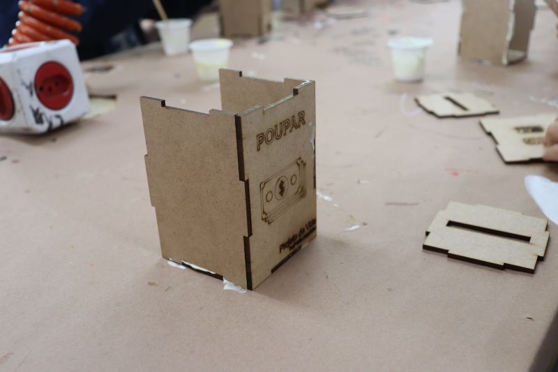 Durante a atividade, os alunos confeccionaram um cofre de madeira. Primeiro, fizeram o projeto em uma folha de sulfite, utilizando uma régua para marcar as medidas. Após a idealização do projeto, o cofre foi cortado em MDF, e cada aluno montou o seu.