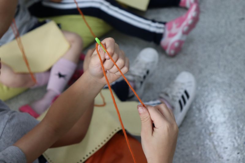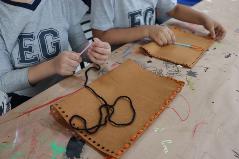 No primeiro momento, as crianças demonstraram grande concentração ao costurar seus próprios saquinhos de feltro, utilizando lã para juntar as laterais. Após a costura, cada aluno recebeu pequenas peças de feltro, preparadas para representar os objetos de conhecimento aprendidos ao longo do semestre. A aula focou no desenvolvimento da coordenação motora e na revisão do conteúdo estudado em sala.