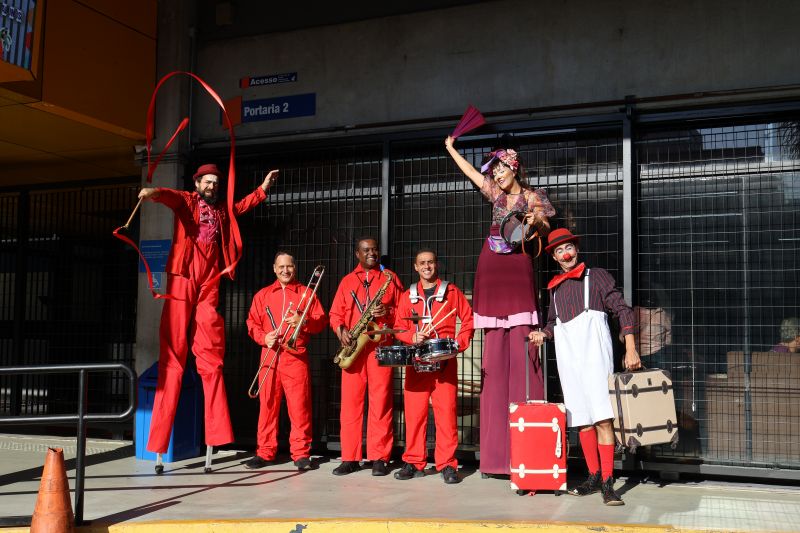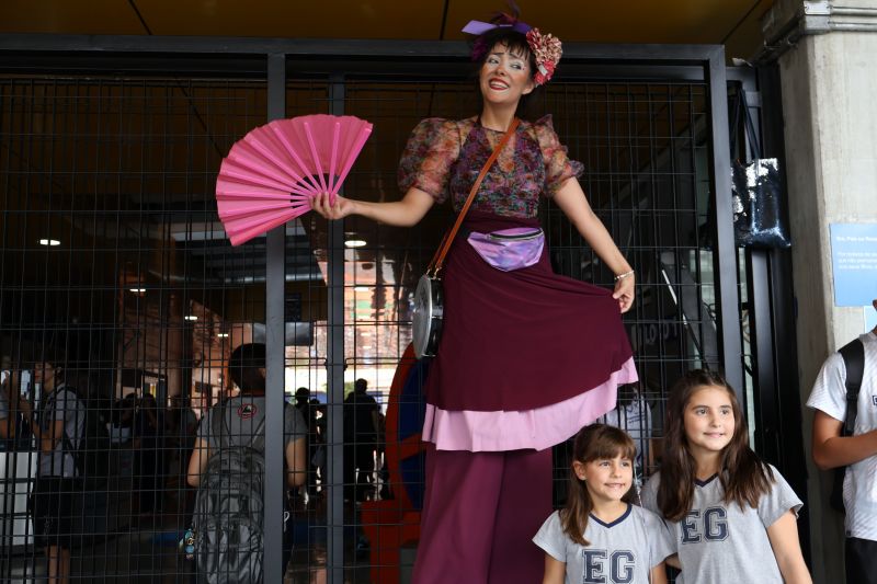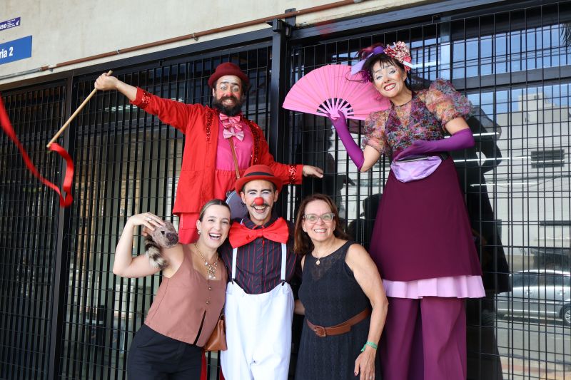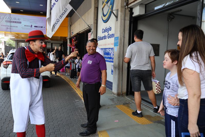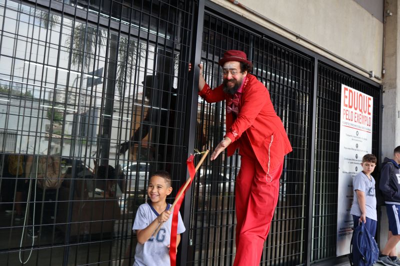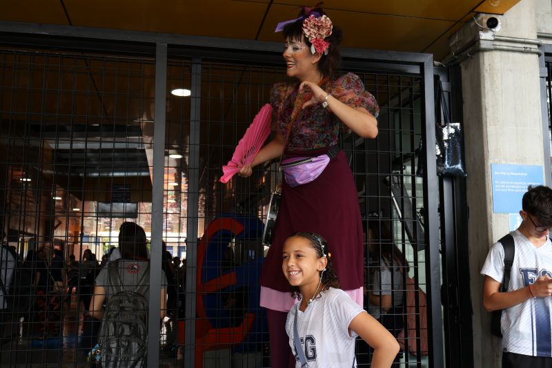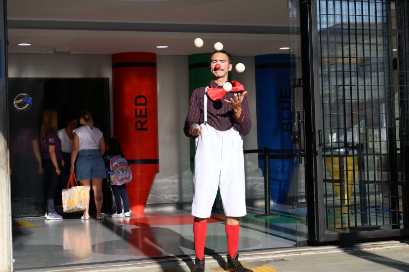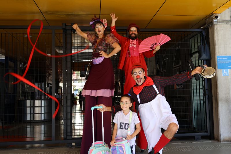 Na entrada, os estudantes foram recepcionados pelos animadores da Cia Fantasy: dois pernas-de-pau, um palhaço e uma banda de soldadinhos de chumbo.