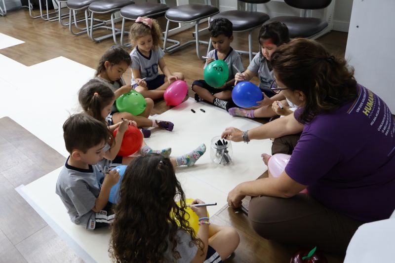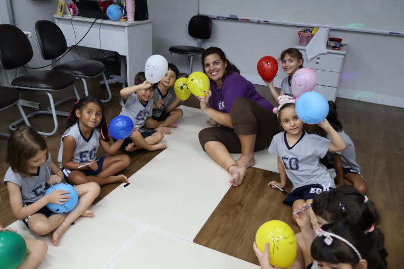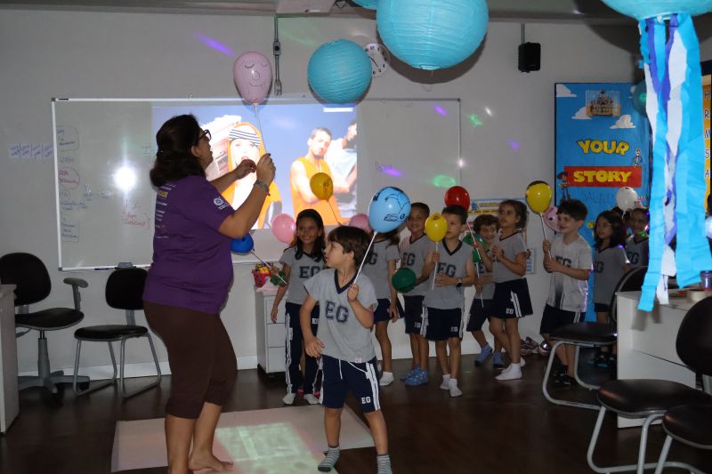 Os estudantes praticaram a linguagem oral, em inglês, com músicas e vivências coletivas. Para finalizar essa dinâmica, com o objetivo de intensificar os conhecimentos previamente obtidos em aula, a professora organizou um desfile, o Balloon Parade, no qual as crianças soltaram a criatividade, decorando seus balões e se divertindo por meio da dança.