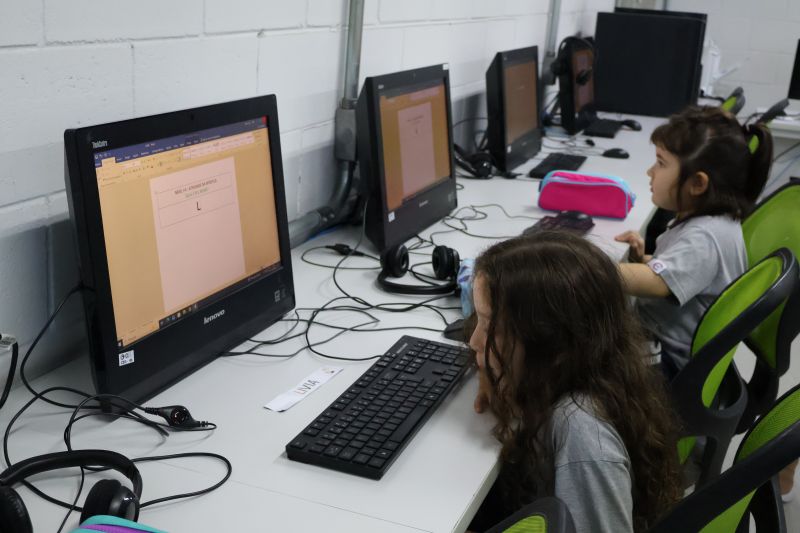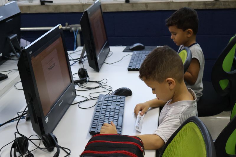 Sob orientação do Hélio, responsável pelo Laboratório de Informática, os pequenos trabalharam habilidades de coordenação e memória, utilizando o teclado do computador.