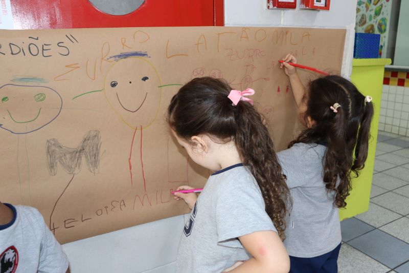 Após a leitura, a turma colocou a criatividade em prática, ao confeccionar um grande cartaz ilustrado com os personagens da história, escrevendo também seus nomes.