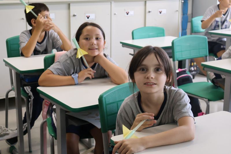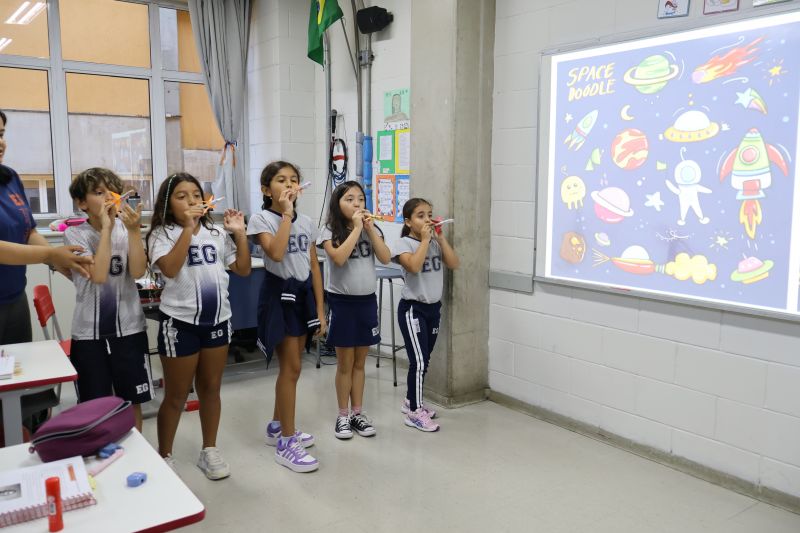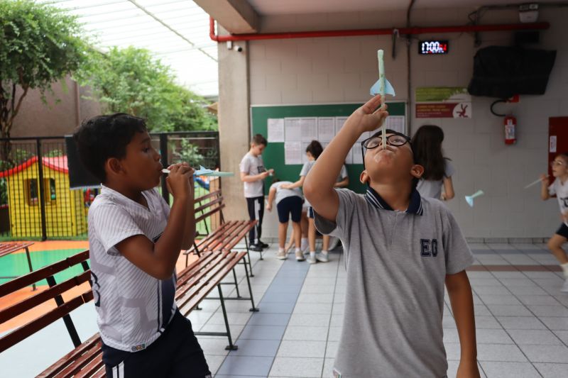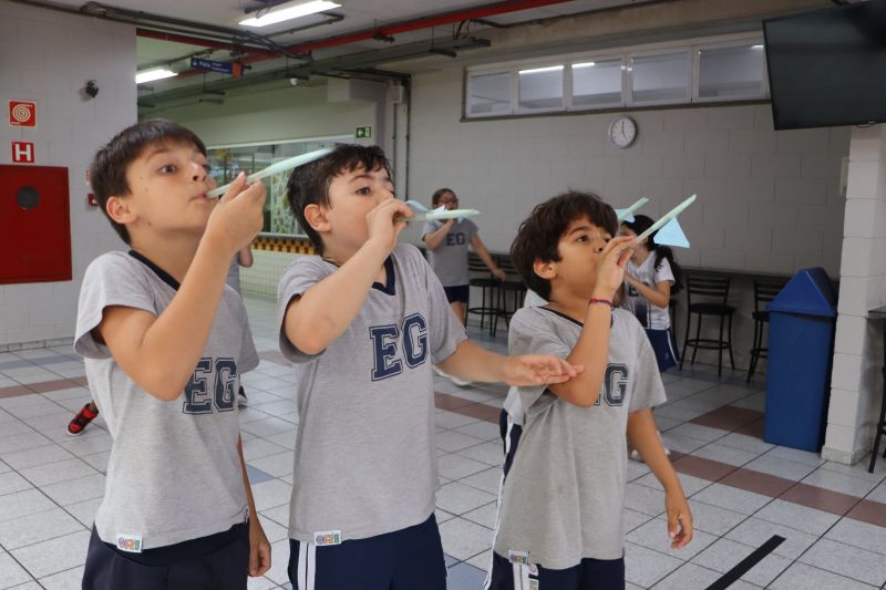Os alunos do 3º ano do Ensino Fundamental, orientados pelas Professoras Tatiana, Letícia, Gina e Paula, construíram um foguete de papel e fita adesiva.