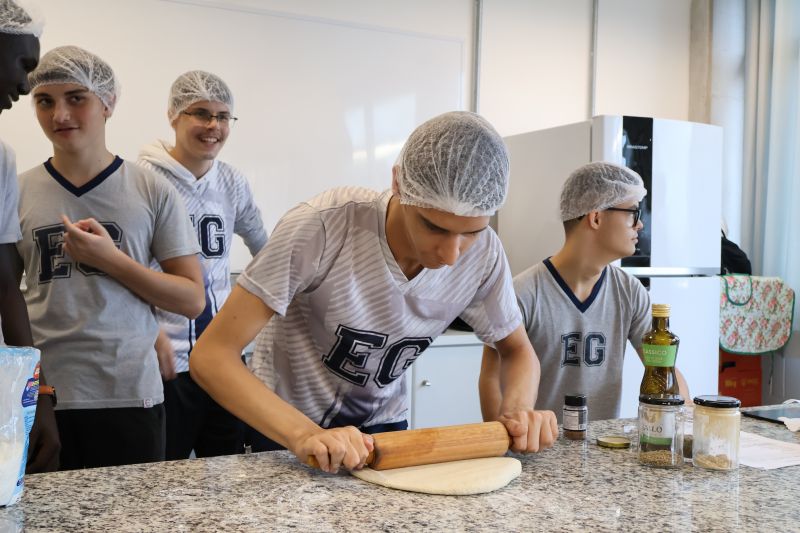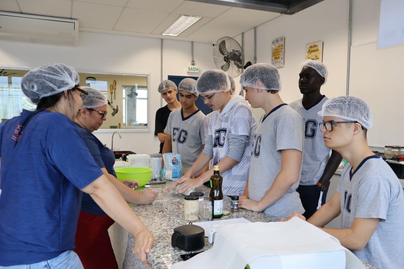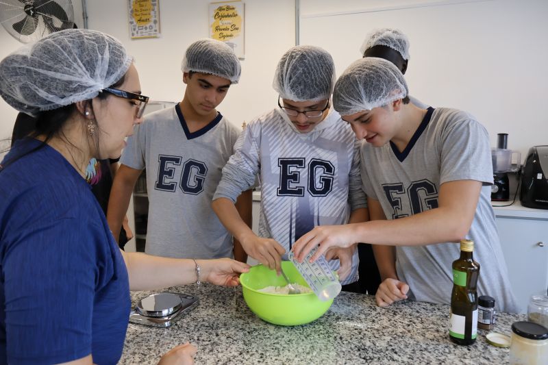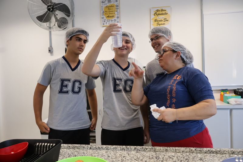 As Professoras Bruna, Raquel, Rosicler e Flávia prepararam uma atividade interativa para os alunos da 2ª série do Ensino Médio na cozinha experimental.