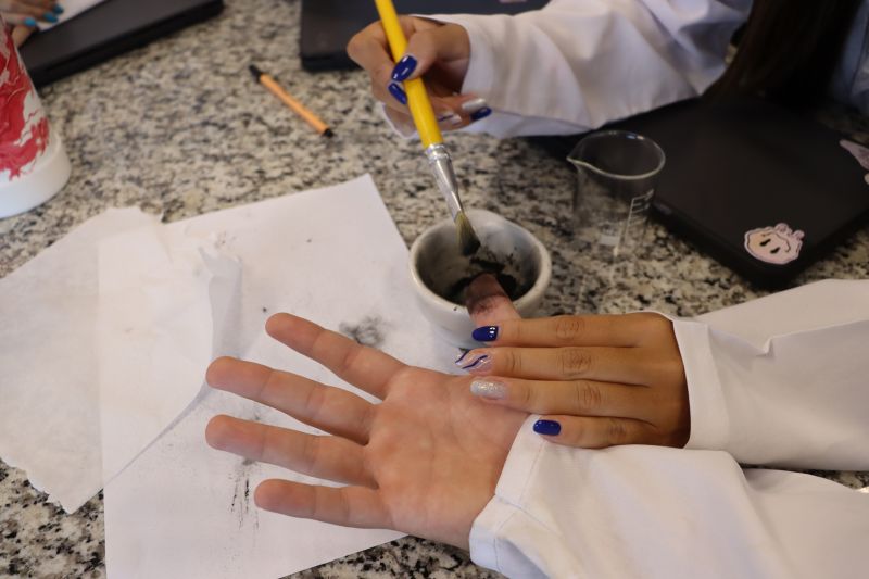 Para isso, com o auxílio da Juliana, responsável pelo espaço, reuniram-se em grupos e realizaram o experimento, pressionando o polegar no pó de carvão e depois em uma folha de sulfite, revelando então a impressão digital.