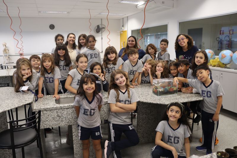 Os alunos do 2º ano do EF, seguindo as orientações das Professoras Juliana, Leila, Maria Cristina e Sheila, confeccionaram um terrário no laboratório.