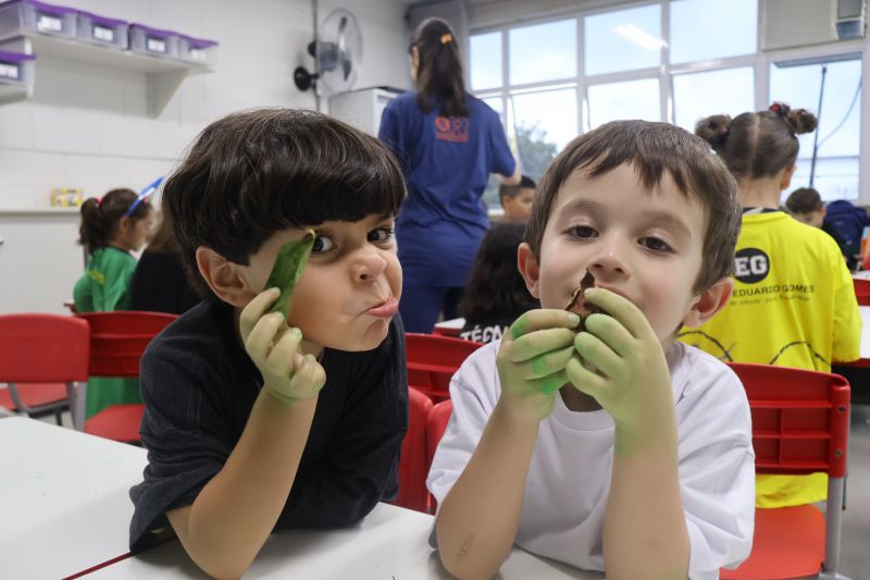 Em grupos, os pequenos confeccionaram o planeta Terra com diversos materiais, como tintas, folhas e papéis para simbolizar a terra, as árvores e a água.