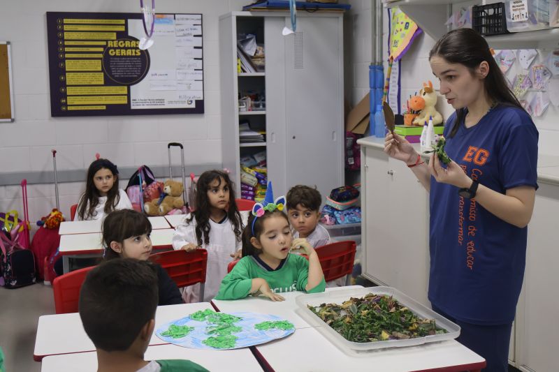 Os alunos do nível 2 da Educação Infantil, sob orientação da Professora Helena, participaram de uma atividade dinâmica sobre o planeta Terra.