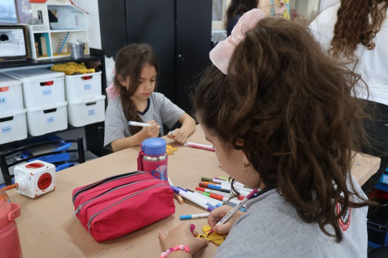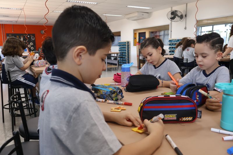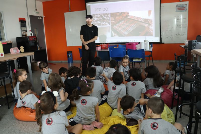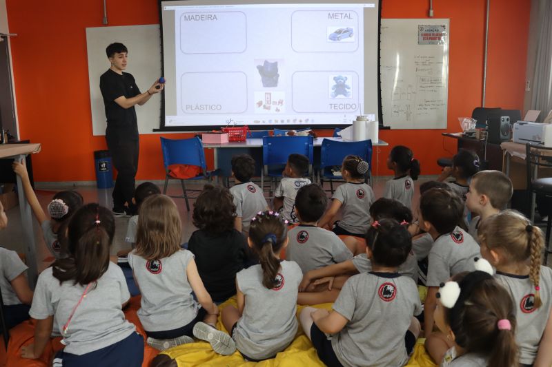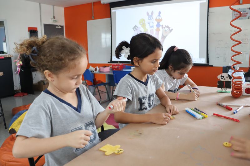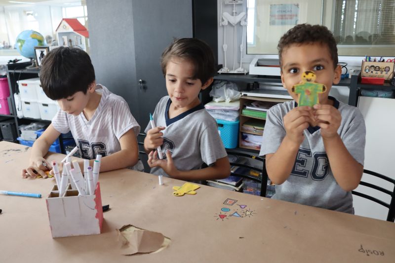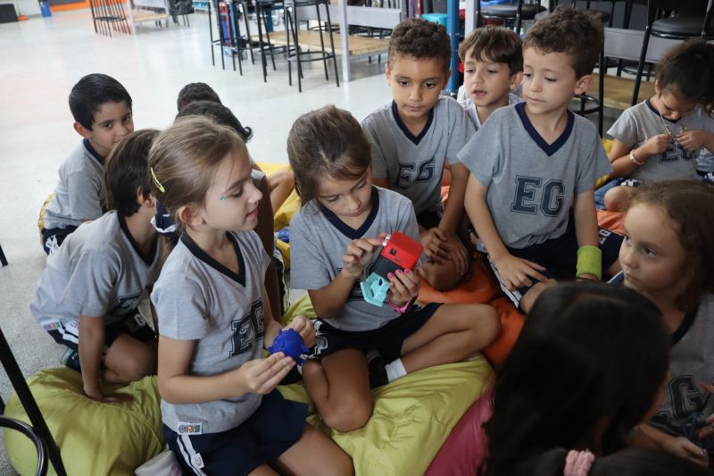 Os alunos do 1º ano do Ensino Fundamental, com auxílio das Professoras Valquíria, Marcela e Rosimeire, foram ao Espaço Maker para participar de uma dinâmica com brinquedos.