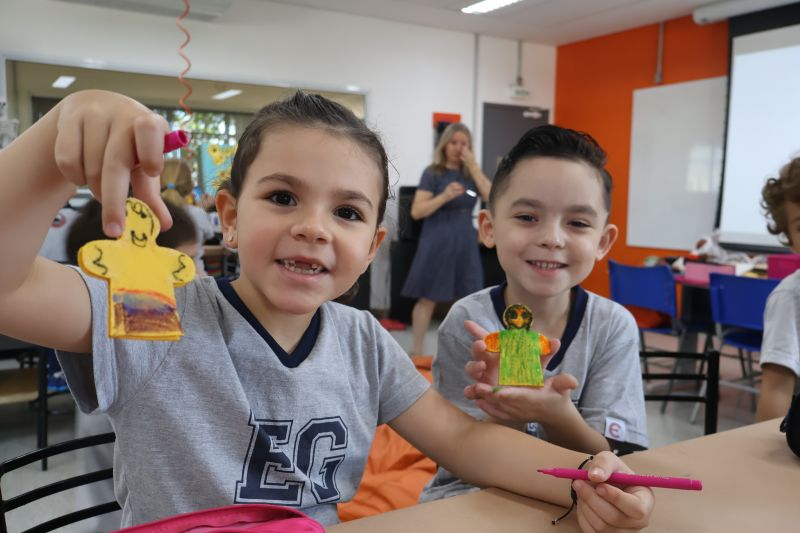 Inicialmente, os alunos observaram os diferentes brinquedos e conversaram sobre os materiais de que são feitos, como plástico, madeira, tecido e papel. Ao final, confeccionaram um dedoche e se divertiram.