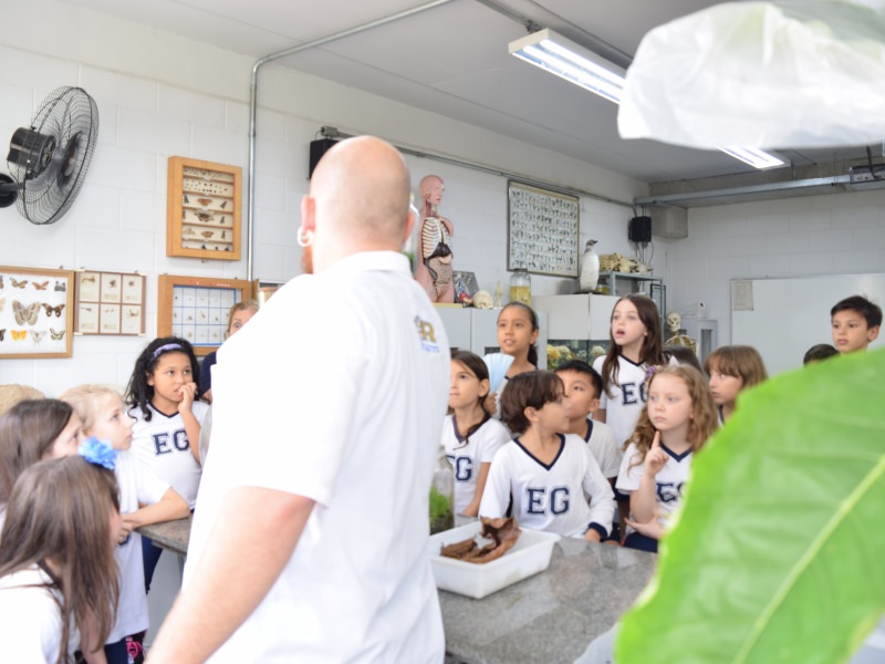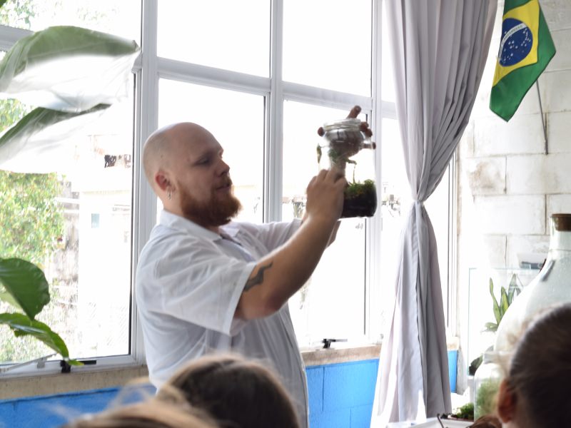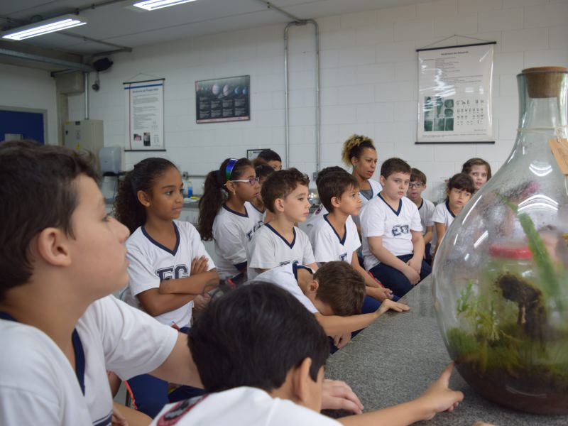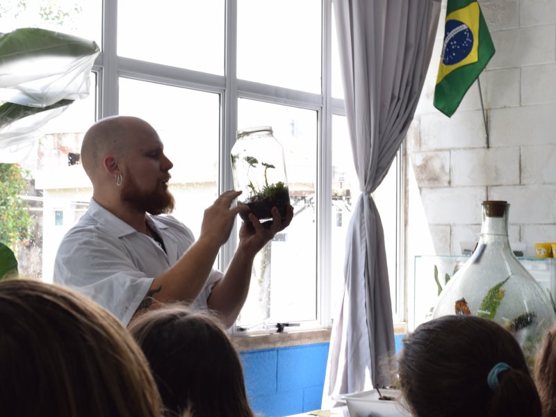 Com um pote de vidro, argila expandida para simular as pedras do solo, terra, musgos para manter a umidade, e plantas, os estudantes ficaram fascinados com o fato de a própria natureza produzir água e nutrientes para manter-se viva. Aprenderam também que, com a transpiração das plantas, não seria necessário regar o terrário. No final da aula, os alunos tiraram todas as dúvidas sobre a dinâmica do mundo natural.