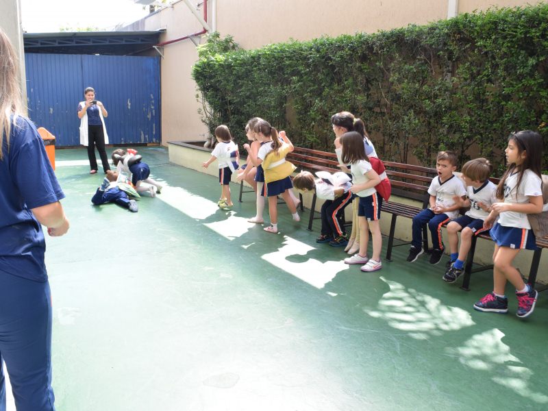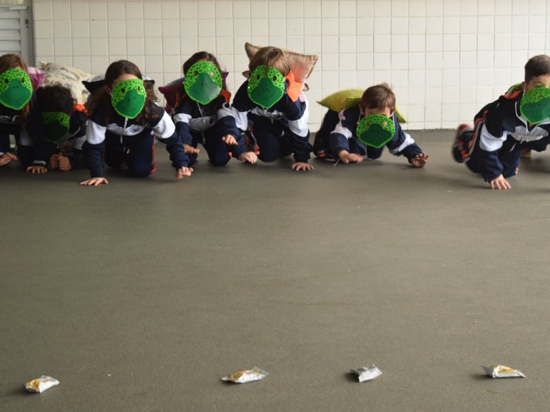 Depois da aula teórica, a turma realizou uma atividade que envolveria “muita rapidez”, afinal, as crianças deveriam correr como tartarugas. Com uma almofada nas costas, para simbolizar o casco da tartaruga, os pequenos foram divididos em dois times: o dos meninos e o das meninas. Quem corresse em posição de tartaruga e atingisse a linha de chegada primeiro ganhava um ponto.
