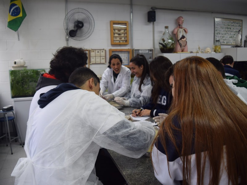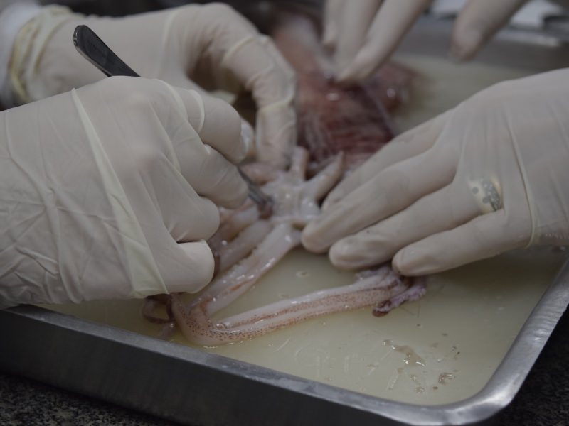 Em um primeiro momento, os alunos dissecaram um peixe, como foi explicado em 2 de maio, no texto “Dissecando um peixe ósseo”. Já na semana do dia 8 de maio, com o auxílio do Prof. Carlos Sebode, foi a vez de os jovens dissecarem a Lula, molusco que tem sua morfologia e anatomia bem diferente do corpo humano. Um exemplo é que, para analisar a boca do animal, é preciso abrir os tentáculos.
