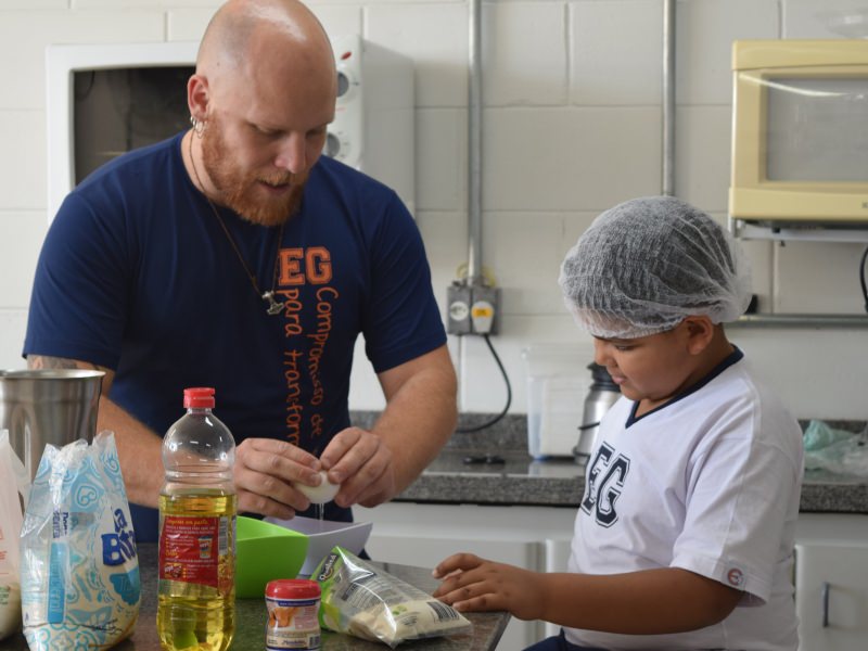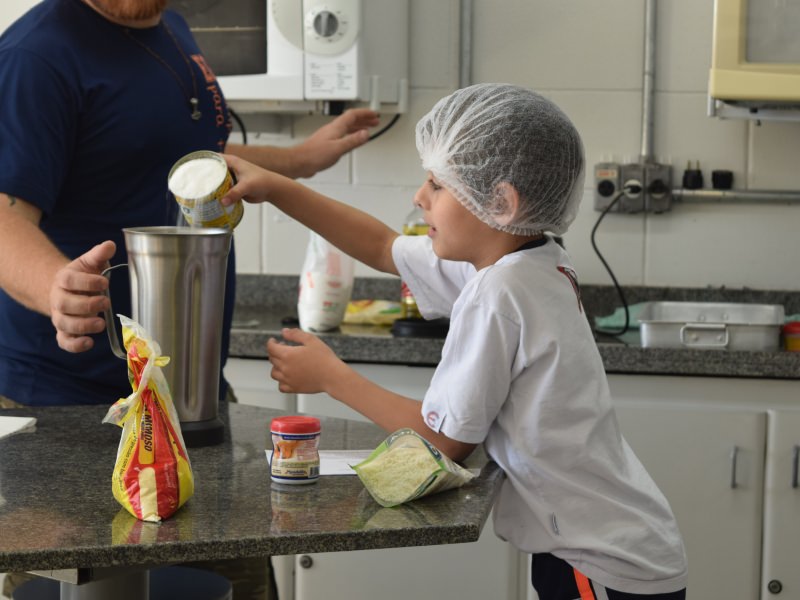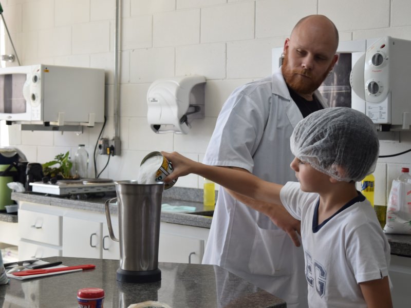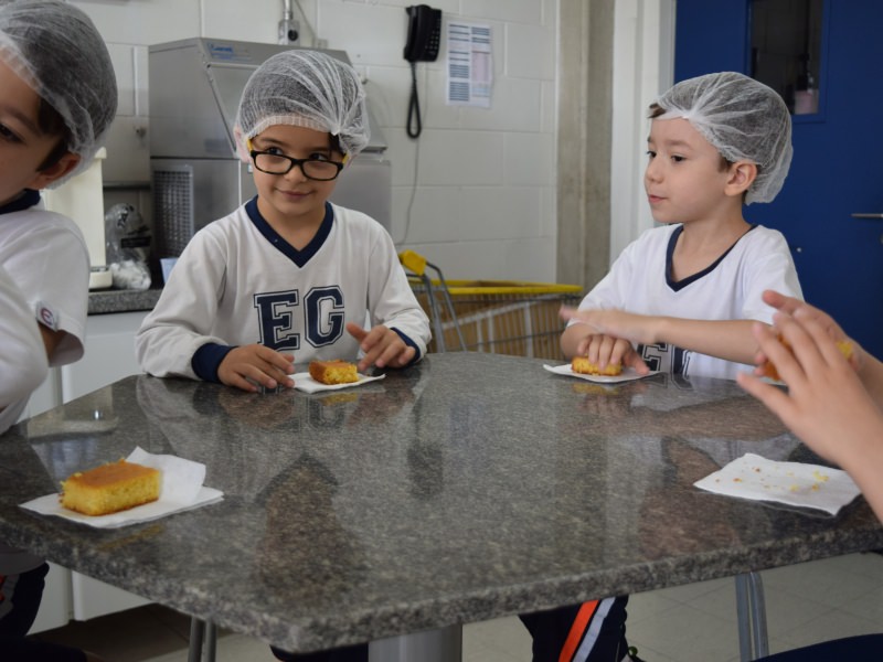 Para encerrar o tema estudado, as professoras do 1º ano, em conjunto com o Professor da cozinha experimental Carlos Sebode, resolveram propor uma atividade para os alunos, onde eles auxiliariam o professo Carlos a produzir um bolo de milho.