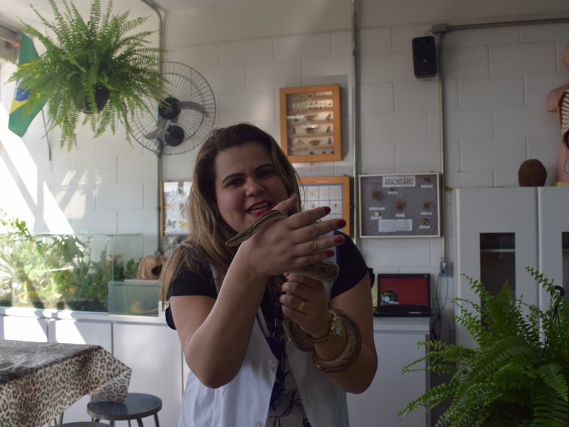 Ao final da aula, os estudantes tiveram uma surpresa e conheceram dois répteis, um macho e uma fêmea, pertencentes ao professor Carlos Sebode. Em seguida, ficaram à vontade para observar a decoração do laboratório e as diversas espécies de animais empalhados ou em conservação.