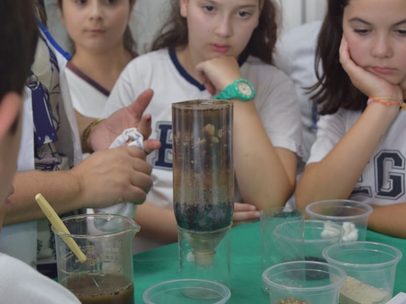 A professora Erika trouxe, como exemplos, trabalhos feitos pelas crianças em outras oficinas Usina de Ideias, com materiais recicláveis, além de ensinar a montar um filtro caseiro com uma garrafa pet, algodão, carvão ativado, areia fina, areia grossa e pedrinhas pequenas e grandes. Depois de pronto, foi colocada uma quantidade de água com terra, no filtro, para ser observado o processo de limpeza da água.