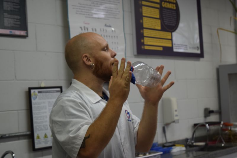 No laboratório de ciências, observaram duas experiências: a primeira para entender como o ar quente sobe, utilizando bexigas, vasilhas e garrafas pet; já a segunda serviu para mostrar o funcionamento da chuva e como as nuvens são formadas, utilizando água quente, cubos de gelo e forma de alumínio.
