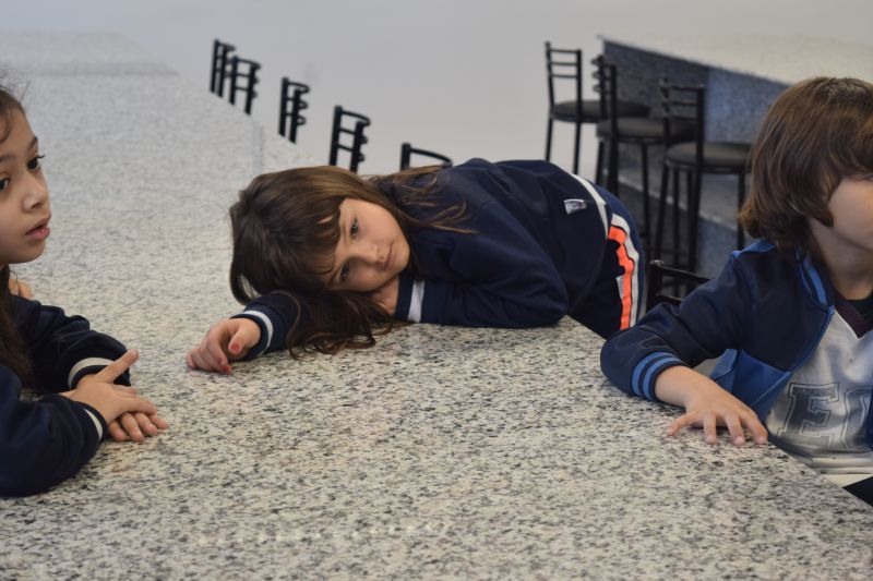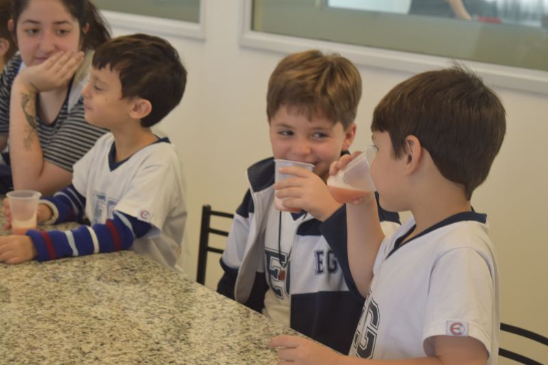 Os alunos do Nível II, da Educação Infantil, orientados pelas professoras Daniela Peres, Rosemeire de Freitas e Débora de Cássia Dantas, aprenderam sobre a existência de água nos vegetais.