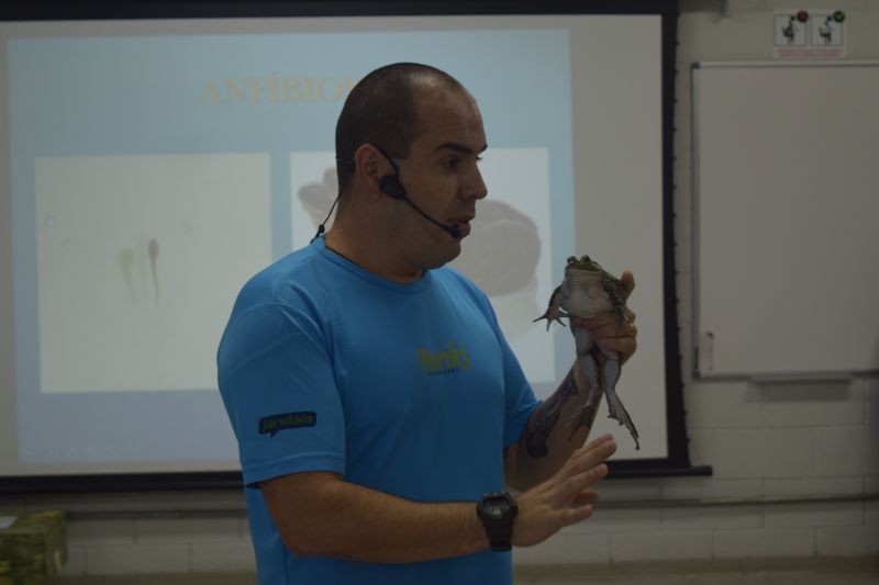 Em sua palestra, falou principalmente sobre os animais que trouxe: rã, chinchila, lagarto, cobra e coruja e sua classificação no mundo animal.