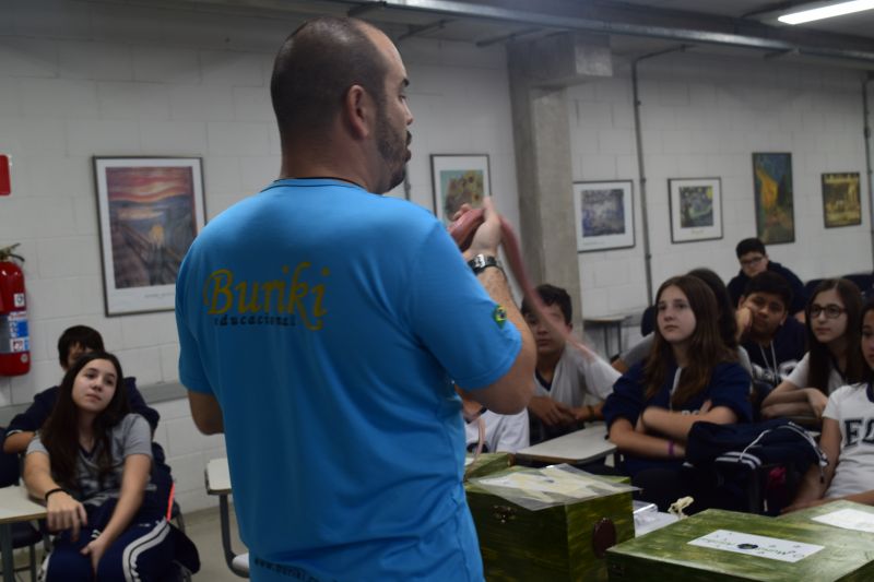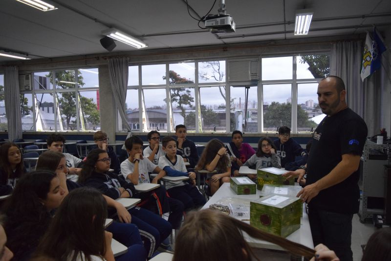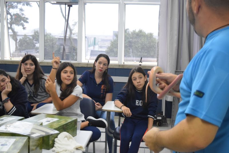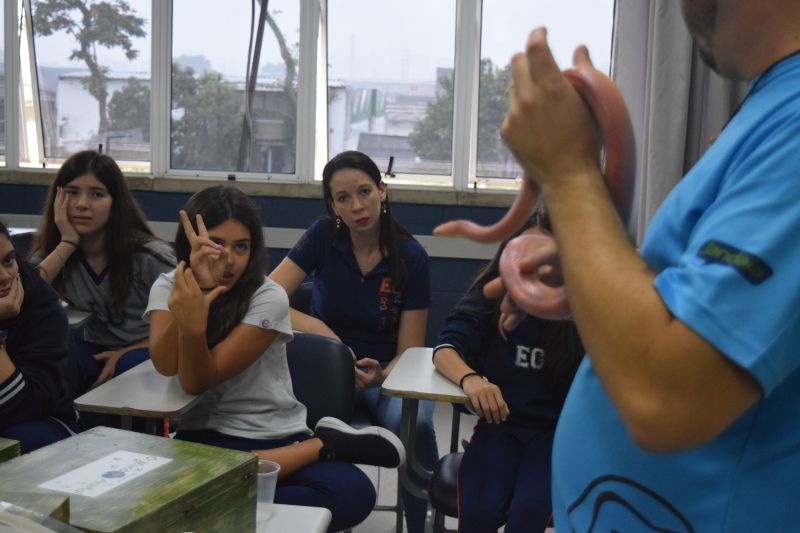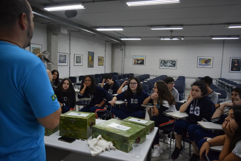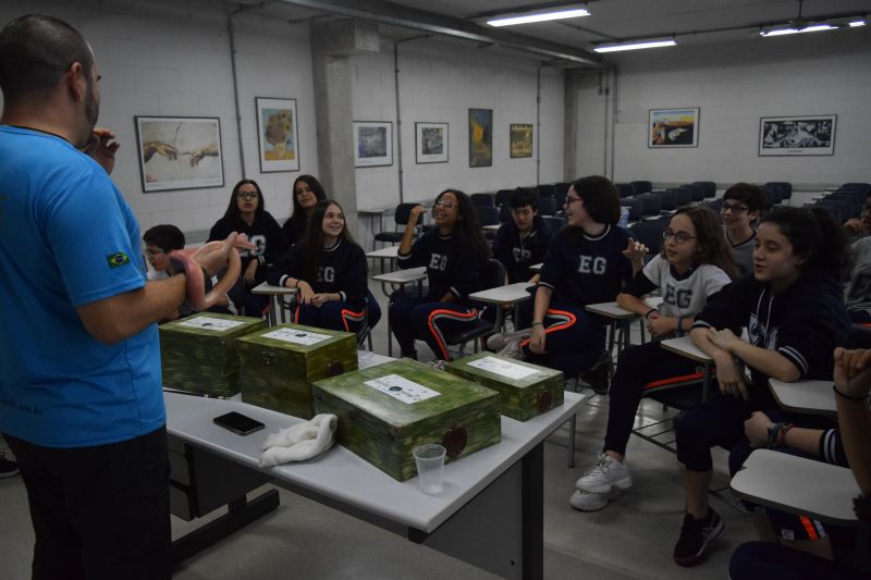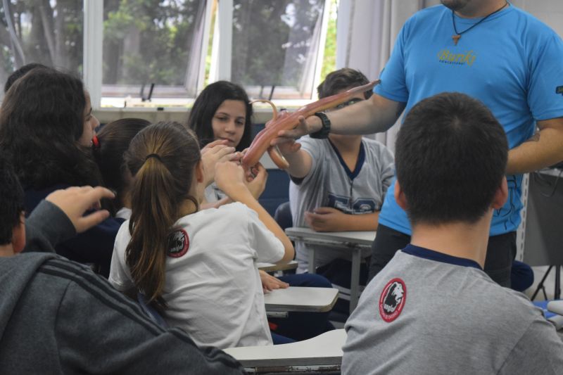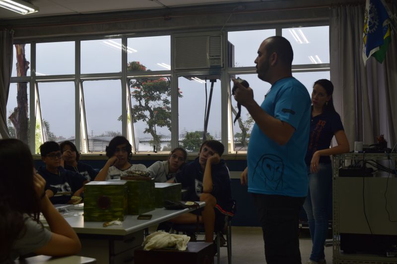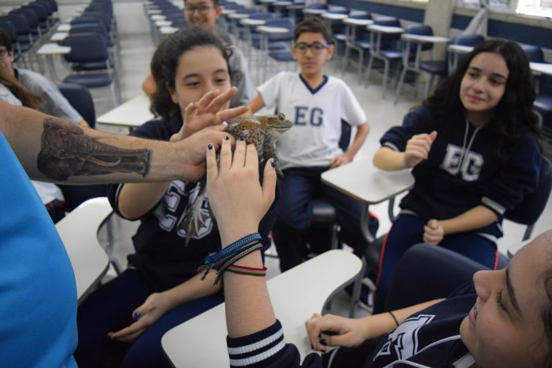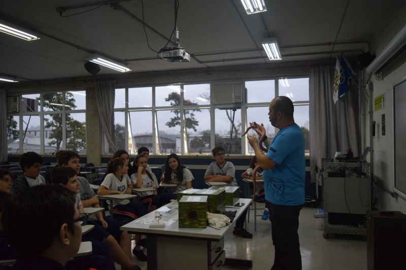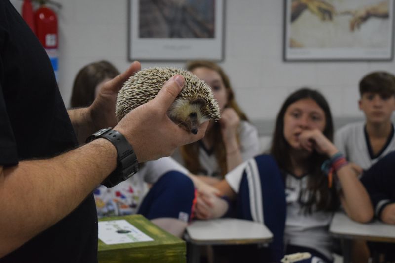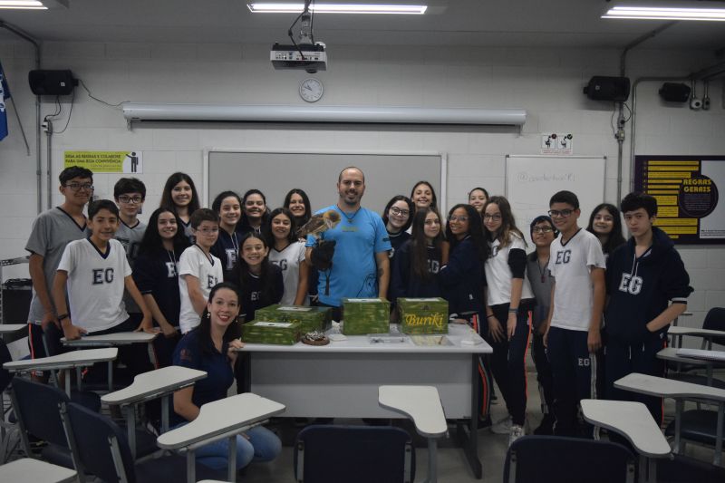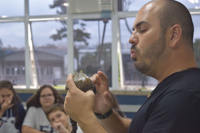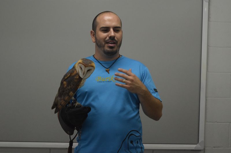Com o auxílio e as explicações do Biólogo André Costa, da empresa Buriki Educacional, os alunos concluíram os estudos sobre esse assunto, em contato com aranha, sapo, ouriço (porco espinho), cobra e coruja.