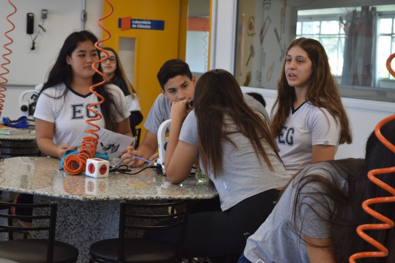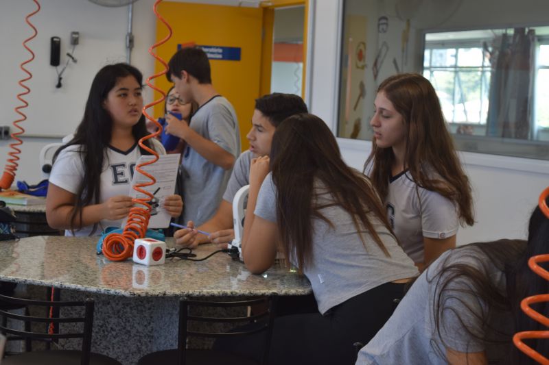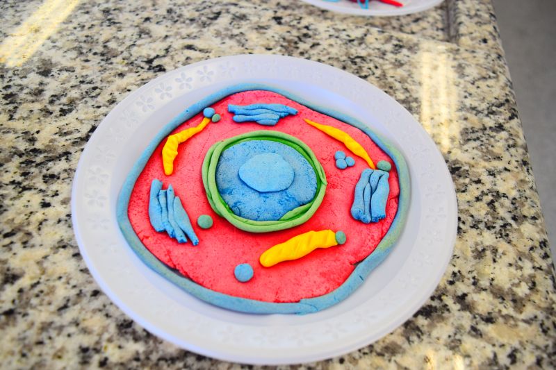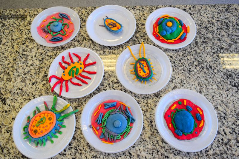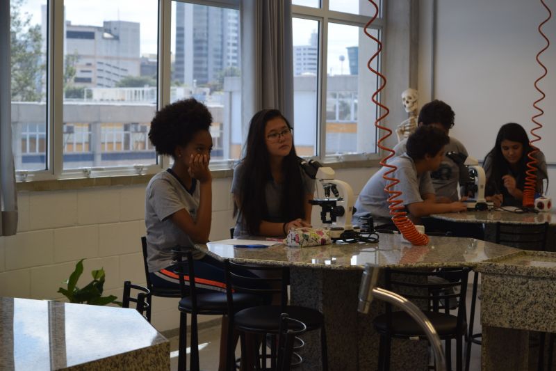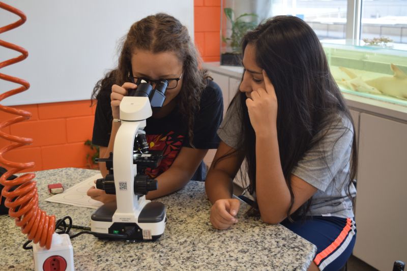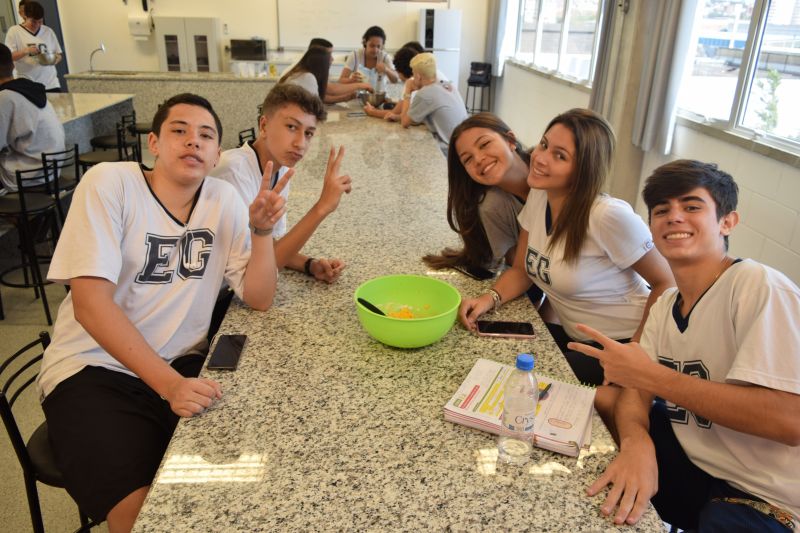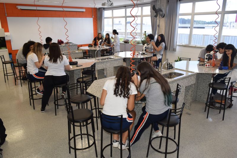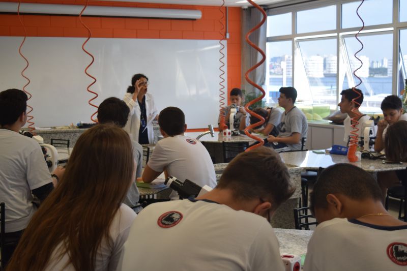 Na Cozinha, os estudantes fizeram uma massinha de receita caseira e, com ela, montaram células procariontes e eucariontes. Já no laboratório, dividiram-se em grupos e observaram, ao microscópio, diversas lâminas citológicas, como de: neurônios, pulmão, intestino delgado, osso denso, epiderme de cebola etc.