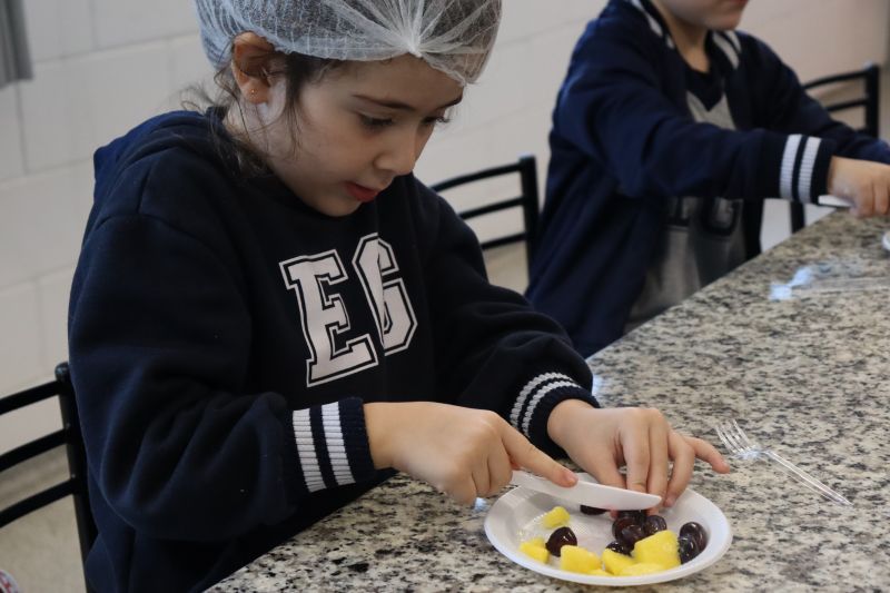 Cada aluno recebeu um pratinho com um pedaço de manga, um de banana e uma porção de uvas. Para incentivar a independência dos alunos, cada um cortou suas frutas, que foram juntadas para formar uma bela salada de frutas. Em seguida, degustaram o prato que ajudaram a preparar.