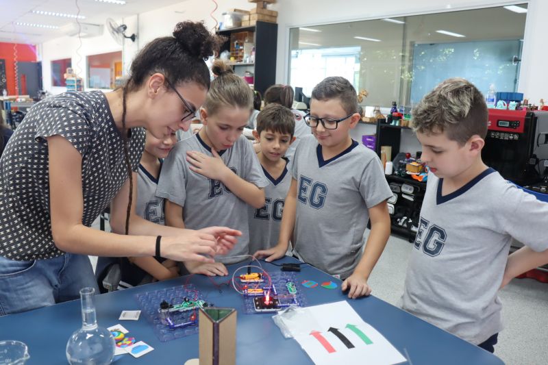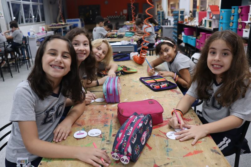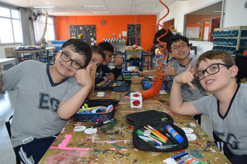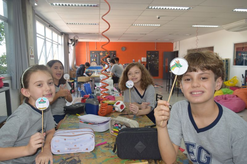 Os estudantes do 3º ano EF foram ao Espaço Maker para construir um taumatrópio, um brinquedo que provoca a junção de duas figuras distintas, dando a impressão de que elas estão no mesmo plano, unidas. Para a construção, utilizaram palito de churrasco e um disco de papel, com uma imagem diferente de cada lado.