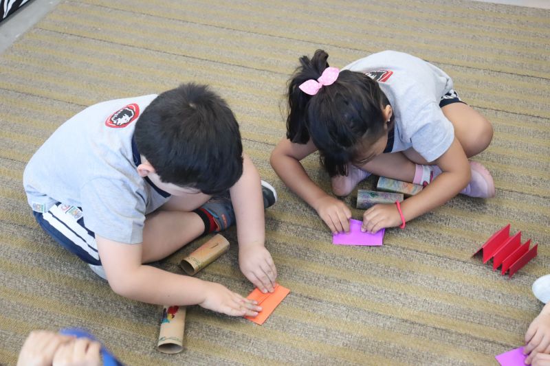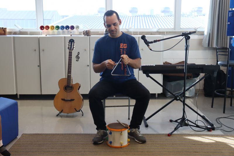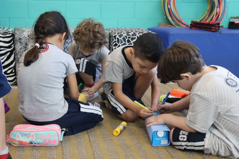 Na sala de musicalização, o Professor Gideon, de Música, apresentou aos estudantes algumas canções e instrumentos muito utilizados em festas juninas. Em seguida, as crianças confeccionaram uma sanfona, utilizando rolo de papel higiênico, papéis e canetas coloridas.
