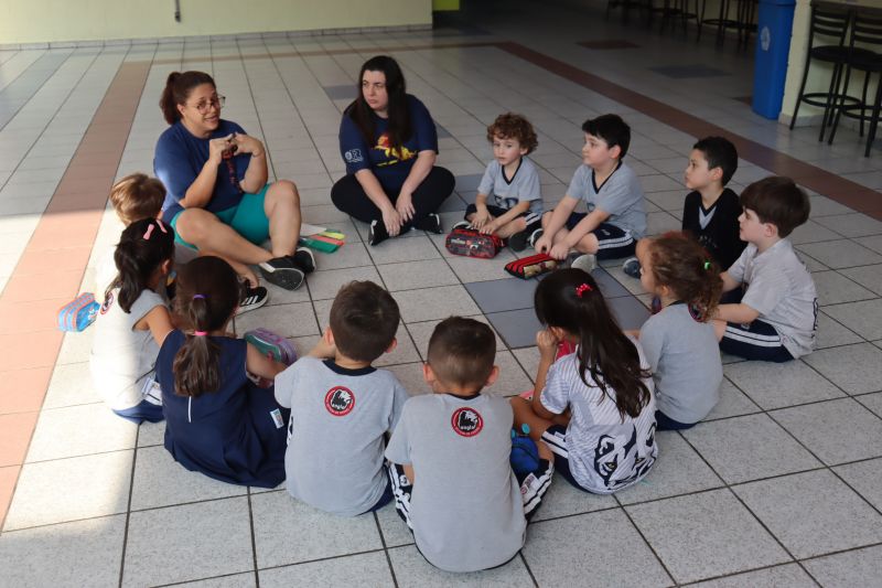 Em outro momento, realizaram uma experiência com o botão de uma flor confeccionado com dobradura. Cada aluno colocou sua flor na água, e o botão se abriu, mostrando a inicial do nome da criança.
