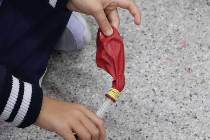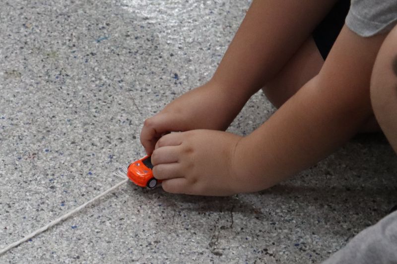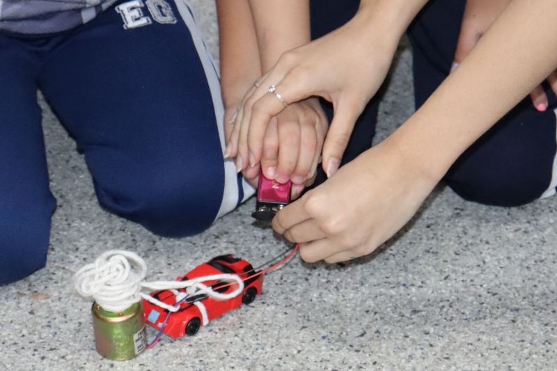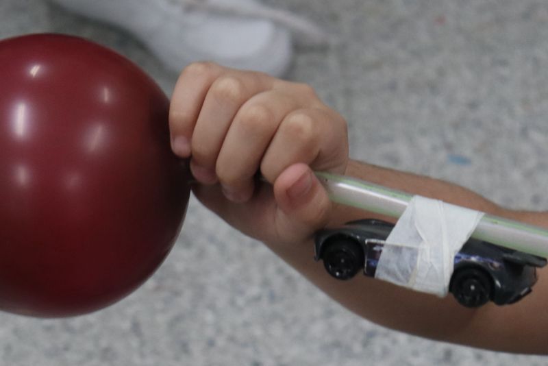 Durante a atividade, as crianças foram desafiadas a movimentar um carrinho sem utilizar as mãos diretamente. Com o auxilio da Maressa, experimentaram diversos materiais e estratégias criativas, colocando em prática conceitos relacionados à geração de força e movimento.