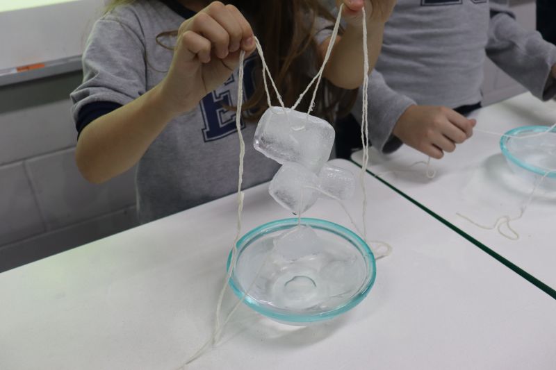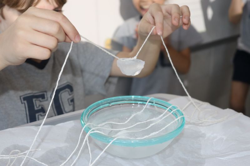Para a realização do experimento, os estudantes utilizaram materiais simples: cubos de gelo, sal, barbante e um pote com água. O objetivo foi desafiá-los a "pescar" o gelo, usando o barbante e o sal.