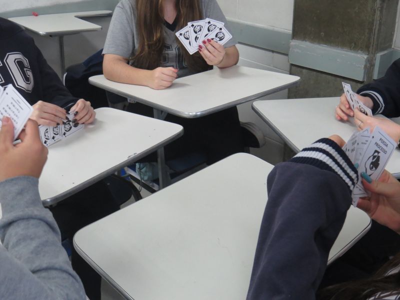 No jogo, os estudantes deveriam agrupar quatro cartas relacionadas a um mesmo conceito. De forma lúdica e divertida, a proposta permitiu que os alunos revisassem conteúdos essenciais em vestibulares e processos seletivos.