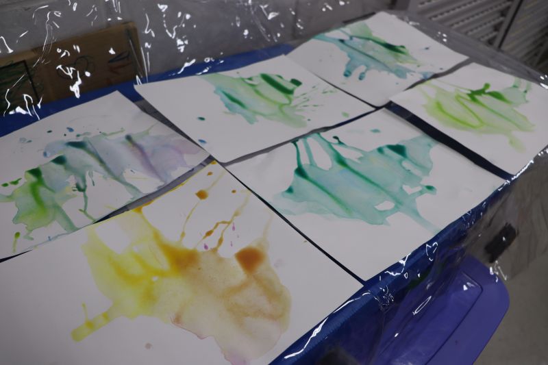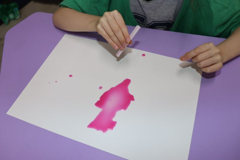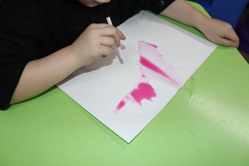 Na primeira etapa da atividade, as crianças fizeram a pintura do sopro: colocaram tinta sobre uma folha em branco e, com a força do próprio sopro, criaram lindas e criativas pinturas.