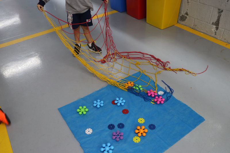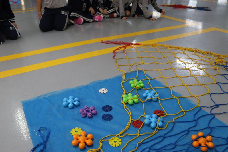 Logo em seguida, a turma se dividiu em dois grupos. Utilizando uma rede, os grupos participaram de uma “pescaria” simulada, na qual o foco foi o raciocínio lógico e a contagem, pois o desafio era contar os diferentes tipos de “peixes” capturados pelas equipes.