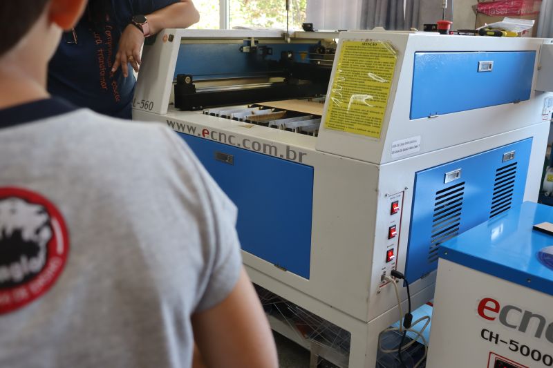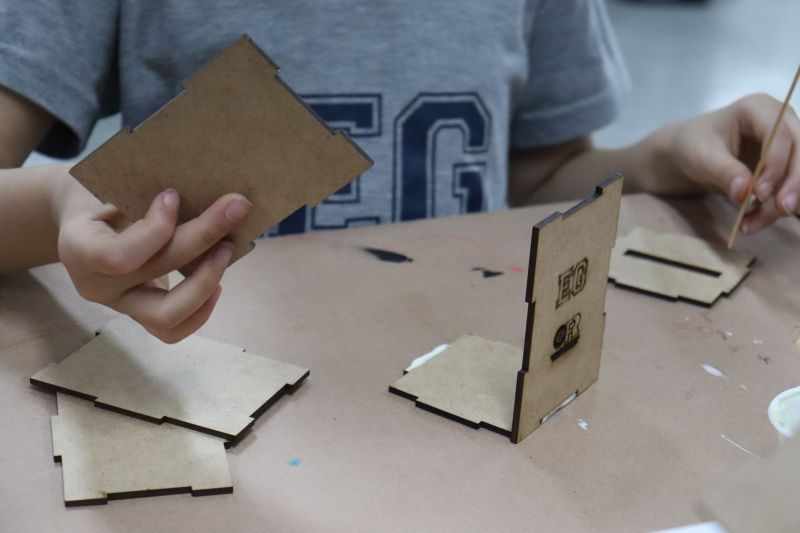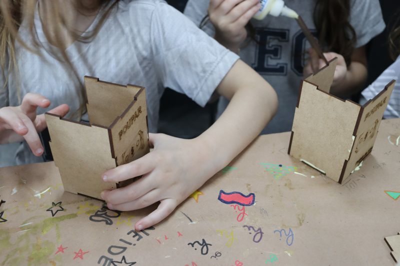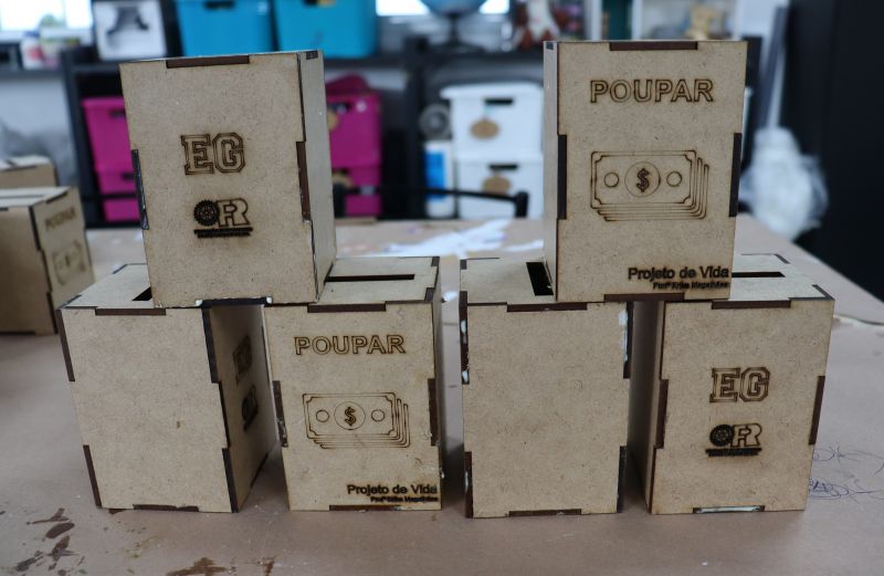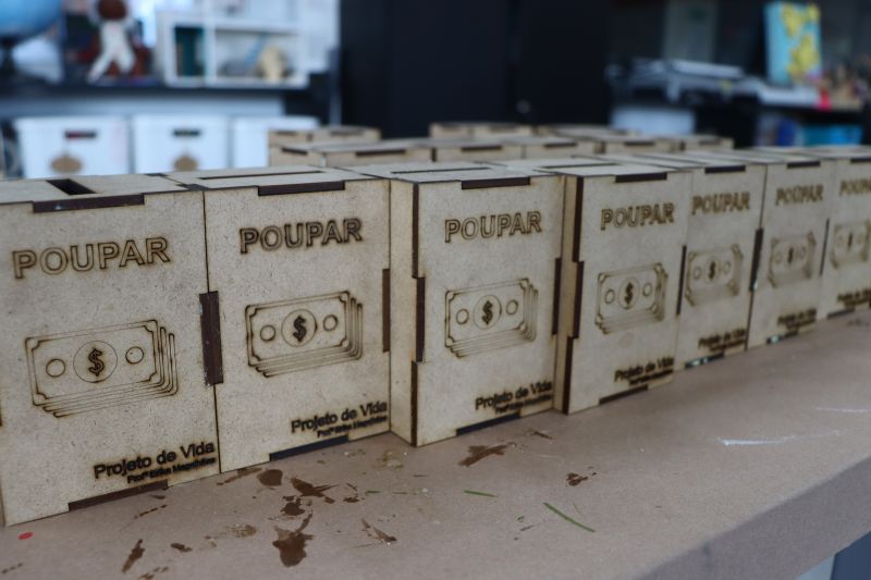 Durante a atividade, os alunos confeccionaram um cofre de madeira. Primeiro, fizeram o projeto em uma folha de sulfite, utilizando uma régua para marcar as medidas. Após a idealização do projeto, o cofre foi cortado em MDF, e cada aluno montou o seu.