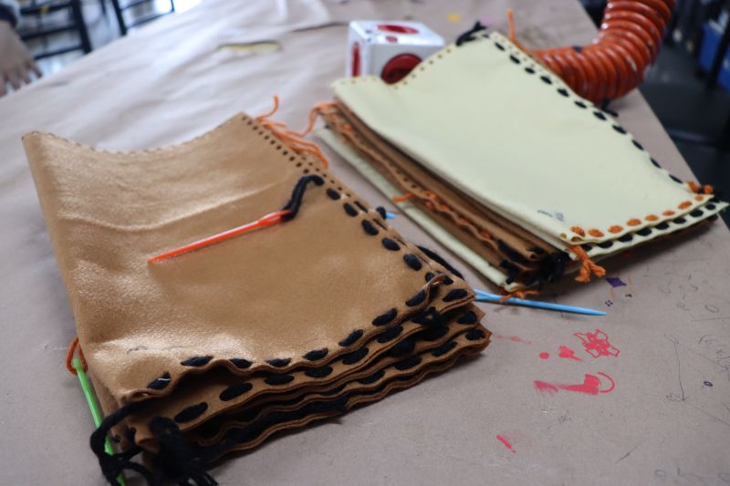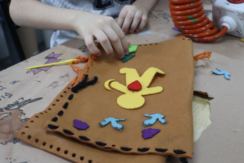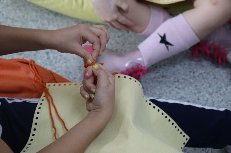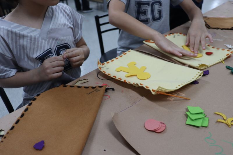 No primeiro momento, as crianças demonstraram grande concentração ao costurar seus próprios saquinhos de feltro, utilizando lã para juntar as laterais. Após a costura, cada aluno recebeu pequenas peças de feltro, preparadas para representar os objetos de conhecimento aprendidos ao longo do semestre. A aula focou no desenvolvimento da coordenação motora e na revisão do conteúdo estudado em sala.