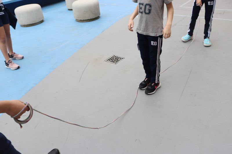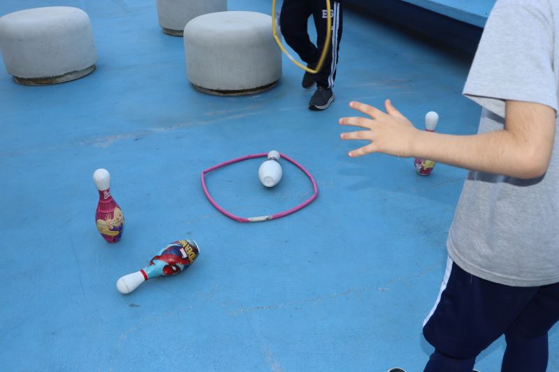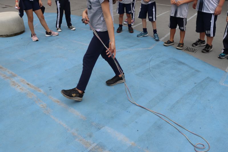 No pátio, eles ensinaram os pequenos a se divertirem de forma saudável, sem necessidade de telas, explorando brincadeiras clássicas que poderão ser levadas para a vida.