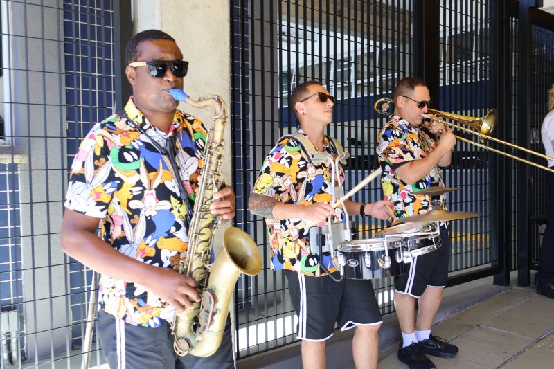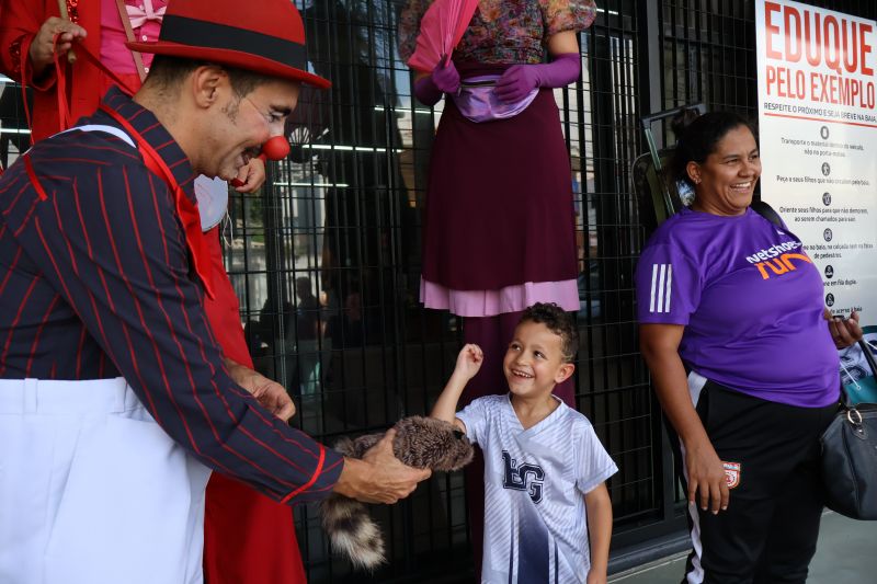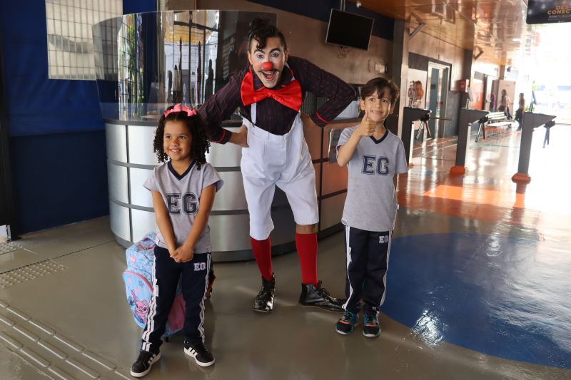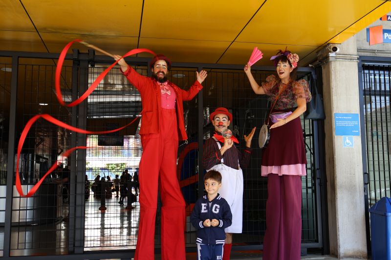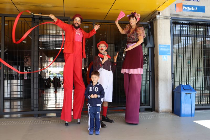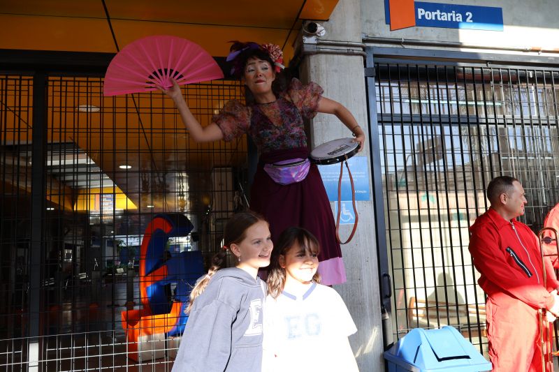 Na entrada, os estudantes foram recepcionados pelos animadores da Cia Fantasy: dois pernas-de-pau, um palhaço e uma banda de soldadinhos de chumbo.