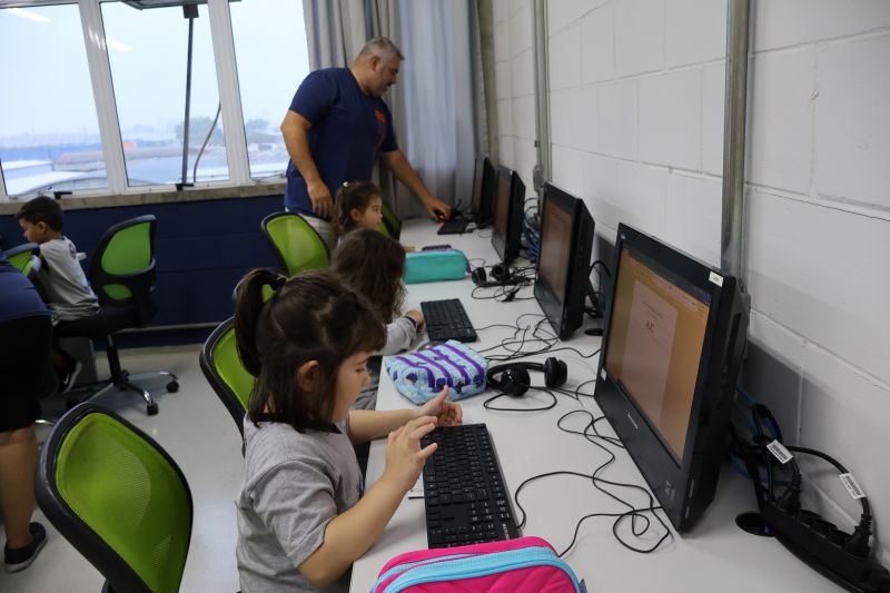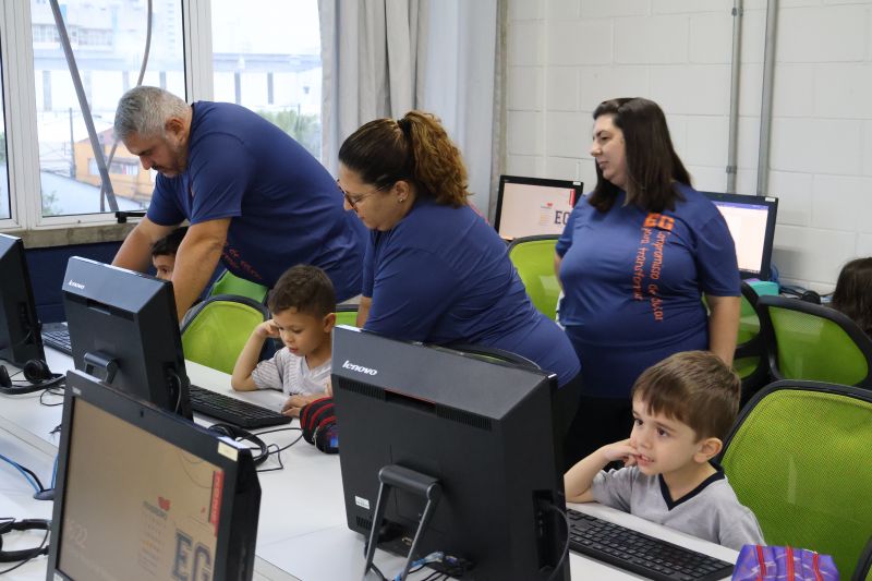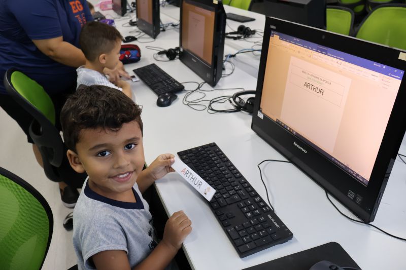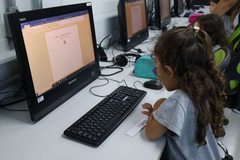 Sob orientação do Hélio, responsável pelo Laboratório de Informática, os pequenos trabalharam habilidades de coordenação e memória, utilizando o teclado do computador.