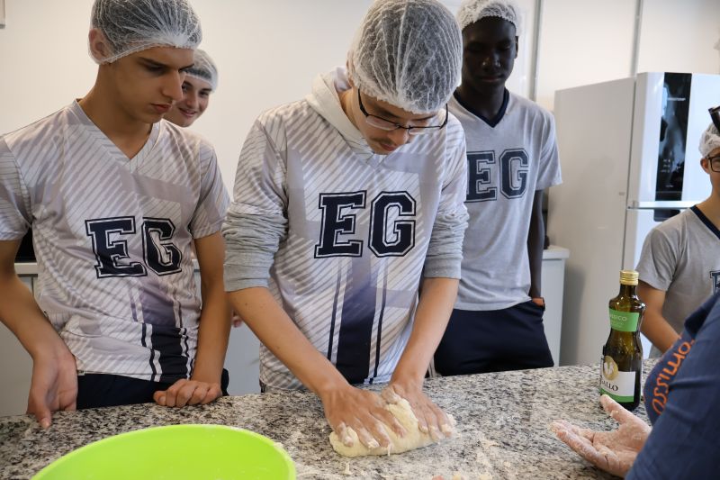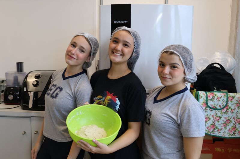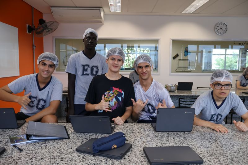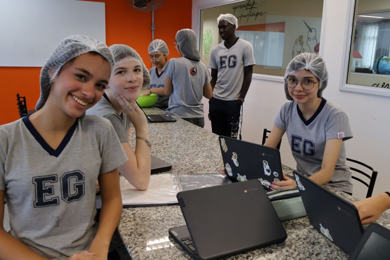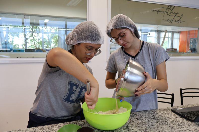 As Professoras Bruna, Raquel, Rosicler e Flávia prepararam uma atividade interativa para os alunos da 2ª série do Ensino Médio na cozinha experimental.